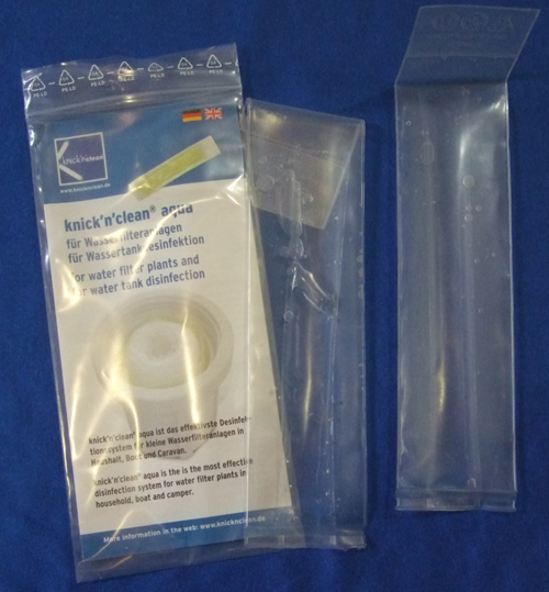 Das knick’n’clean® aqua Desinfektionsmittel für Umkehrosmoseanlagen wird im Doppelpack geliefert und reicht für zwei Desinfektionen. knick’n’clean® aqua ist so ausgelegt, dass es im Freiraum zwischen der Filterkerze und dem letzten/linken Filtergehäuse eingesetzt wird. Nach etwa einer Stunde ist die volle Wirksamkeit erreicht. Im aktivierten Zustand tritt das gasförmige Desinfektionsmittel durch die Wandung des Außenbeutels. Für ca. 8–14 Tage tritt das Desinfektionsmittel aus. Hierdurch wird eine Grunddesinfektion im gesamten System erreicht. Bei jedem Filterwechsel bzw. alle halbe Jahr sollte spätestens eine Grunddesinfektion mit knick’n’clean® aqua durchgeführt werden. Der knick’n’clean® aqua- Beutel kann problemlos im Gerät verbleiben, bis der nächste Filterwechsel durchgeführt wird. Eine Verträglichkeit mit gängigen TFC- Umkehrosmose-Membranen wurde geprüft. Selbst nach mehreren Monaten mit mehrfach erhöhter Dosis wurde keine Schädigung der Membranen festgestellt. knick’n’clean® aqua wirkt vom Einsatzpunkt bis zum Aktivkohle-Nachfilter und desinfiziert so die ganze Filteranlage über sämtliche Membranen/Filter, einen ggf. vorhandenen Speichertank und die Abwasserleitung.